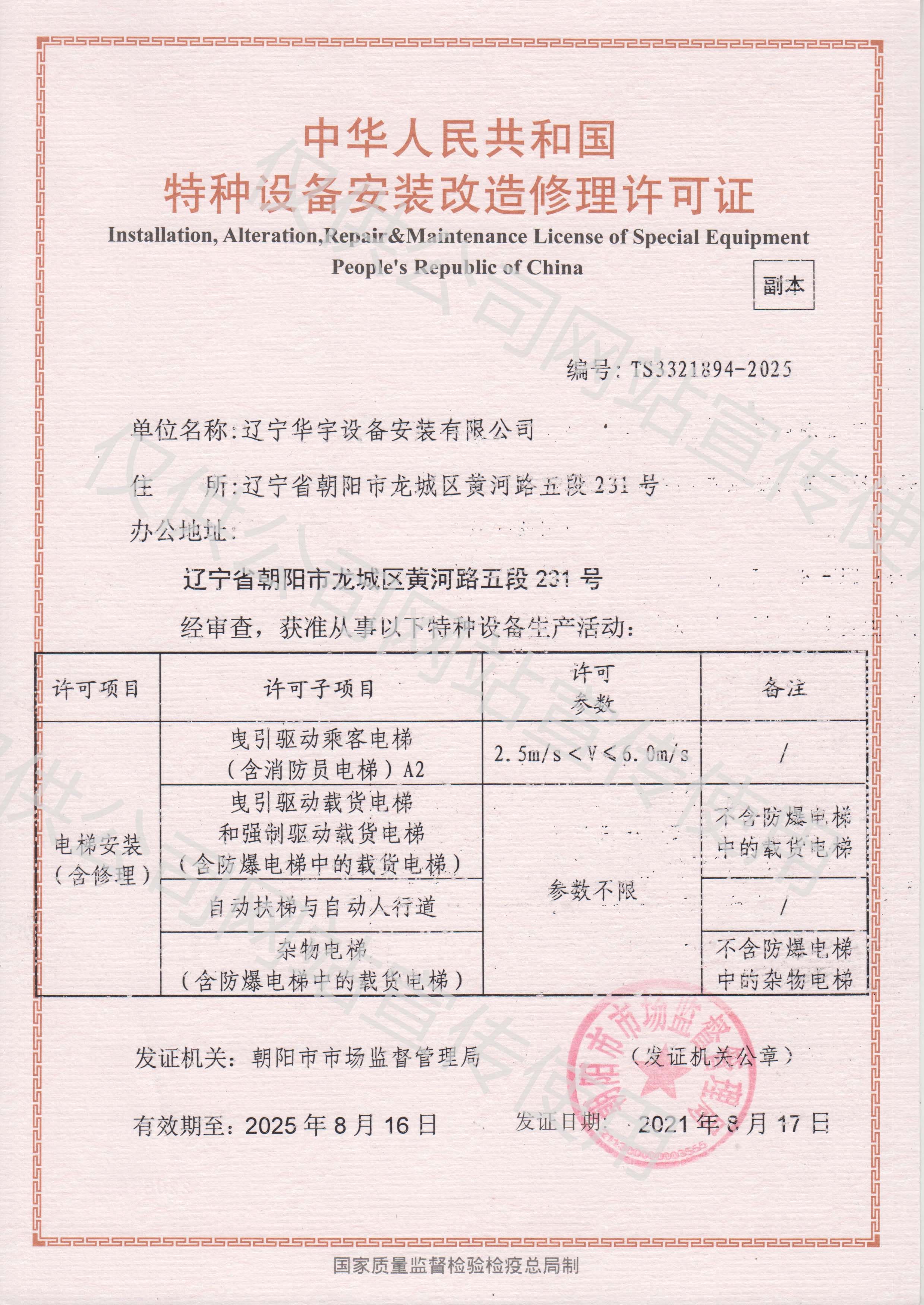 ? ? ? ?? 遼寧華宇設備安裝有限公司成立于2002年7月15日,注冊資金10000萬。公司占地面積60余畝,建筑面積4000余平。現取得消防設施工程專業承包一級資質、消防設施維護保養檢測一級資質、建筑機電安裝工程專業承包一級資質、電子與智能化專業承包二級、建筑裝修裝飾工程專業承包二級、安全技術防范設施設計施工二級資質、建筑工程施工總承包三級、電力工程施工總承包二級、輸變電工程專業承包二級資質、電力承裝、承修、承試三級資質、鋼結構工程專業承包三級資質和地基基礎工程專業承包三級。同時是人防工程通風(防化)設備生產安裝企業,并具備電梯銷售、電梯安